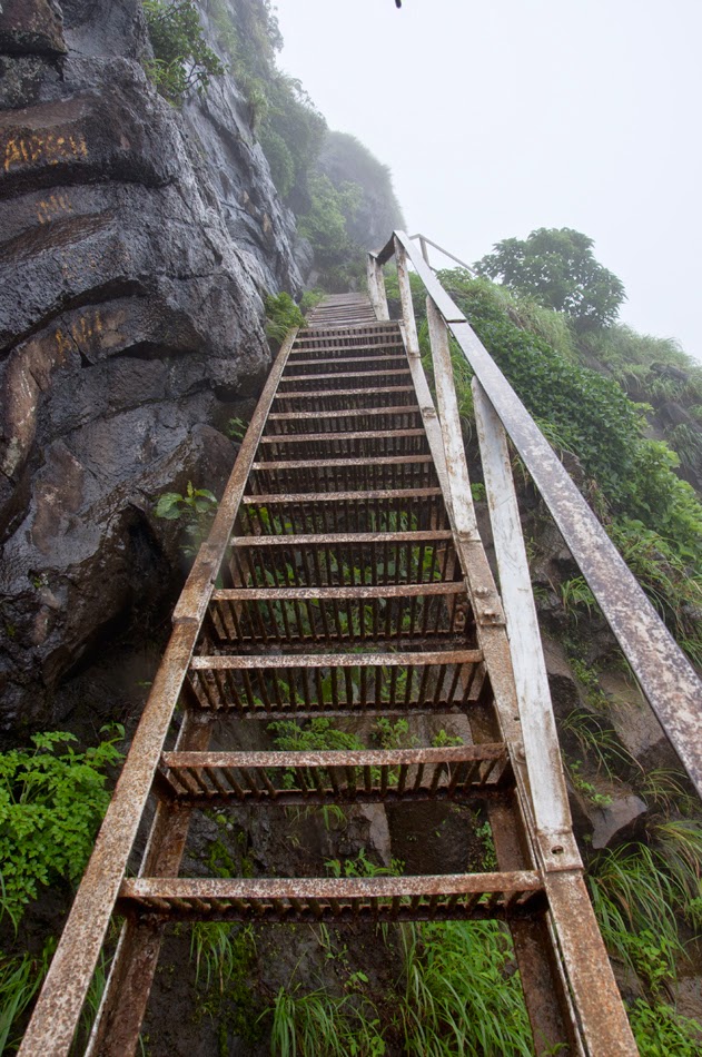 दगडू म्हणाला … १५ मिनिट चालायचं … मग २५० पायऱ्या चढायच्या … मग थोड्या लोखंडी पायऱ्या चढायच्या … मग पोचलो बघा गडावर :)… पाऊस एकदम मजबूत सुरु झाला … जमल तस फोटो काढण् सुरु होत … म्हणलं प्रमुख प्रमुख गोष्टी तर टिपल्या पाहिजेत… पायऱ्या … लोखंडी पायऱ्या