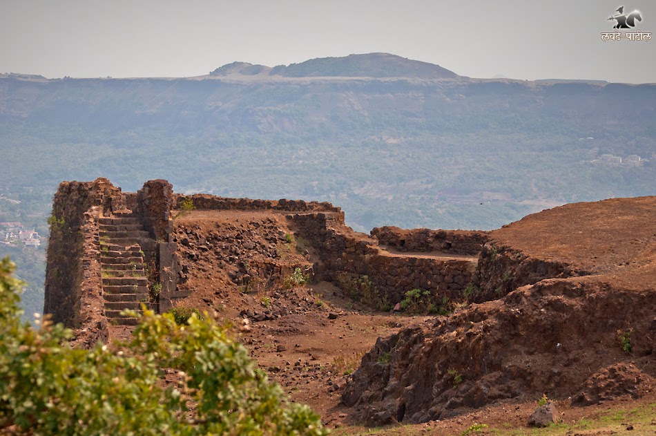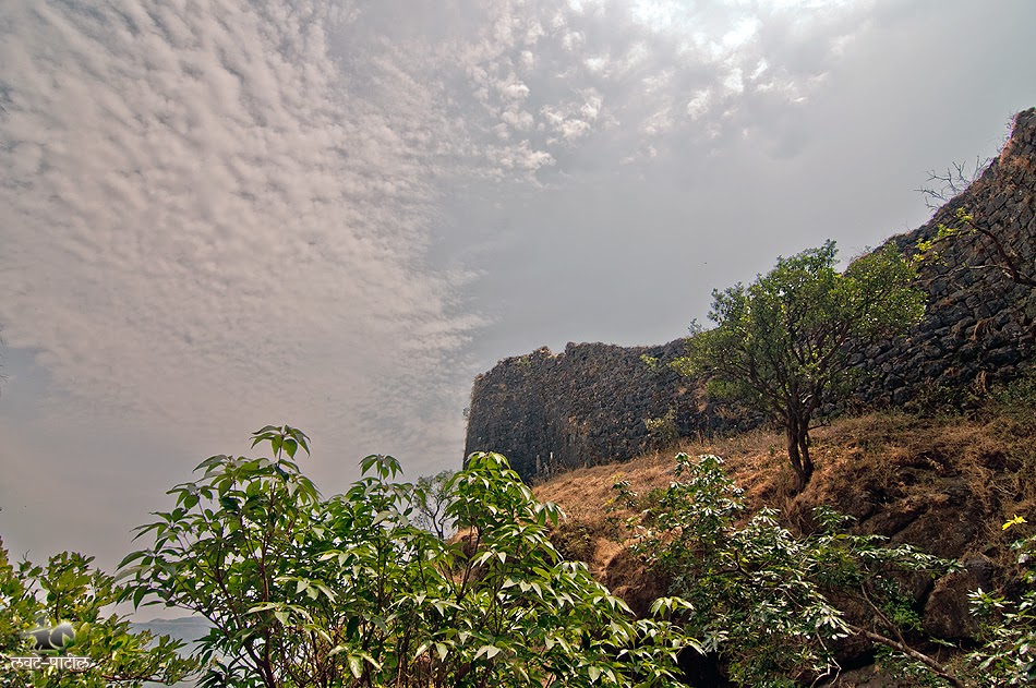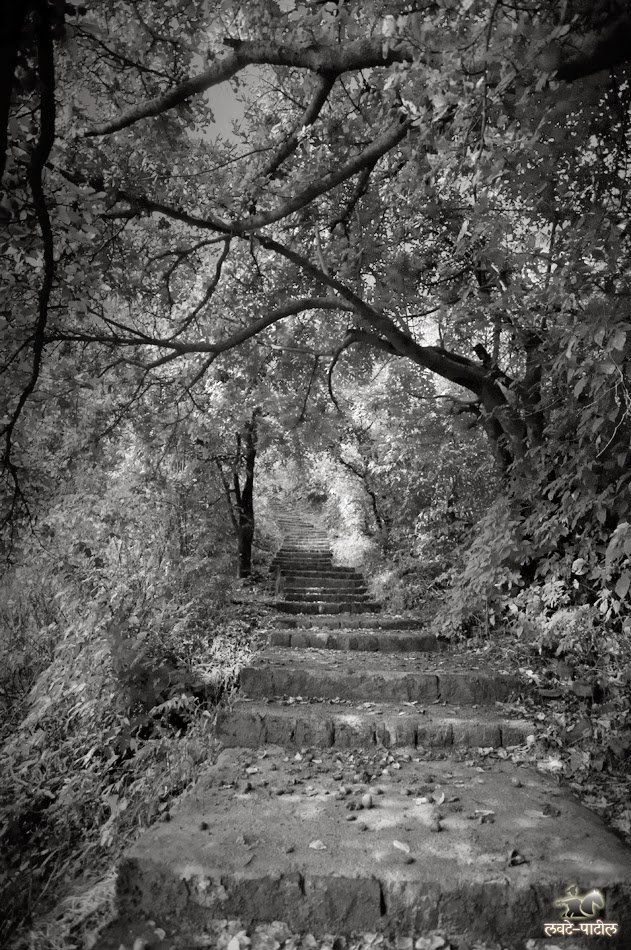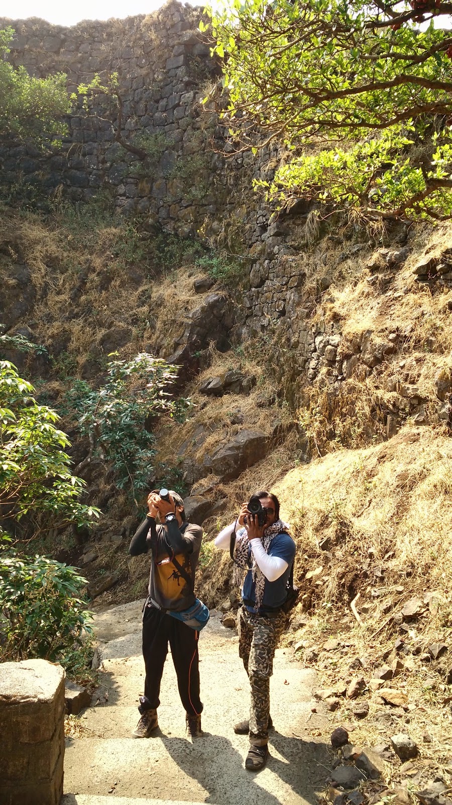 नेहमीप्रमाणे पायपीट सुरु केली, सुरवातीला अगदी टिपिकल सह्याद्री वाट आहे, आजूबाजूला भरपूर झाडी .. त्यामुळे सावली खूप मिळाली … उन फार होते … तिघेही मस्त घनदाट झाडी पाहत गड चढत होतो … चांगल्या फ्रेम मिळत होत्या त्यामुळे कॅमेरा काही बंद नव्हता … आजूबाजूला सहारा वाल्याने रवलेले विजेचे खांब दिसत होते, गड पण मस्त दिसत होता, मजबूत नैसर्गिक तटबंदी गडाला लाभली आहे. अतिशय देखणा असा गड आहे, झाडा-झुडपातून थोडा वेळ चालल्यावर पायर्या सुरु झाल्या, पायर्या एकदम चांगल्या स्थितीत होत्या, सहारा वाल्याने बर्यापैकी काम केले होते.
