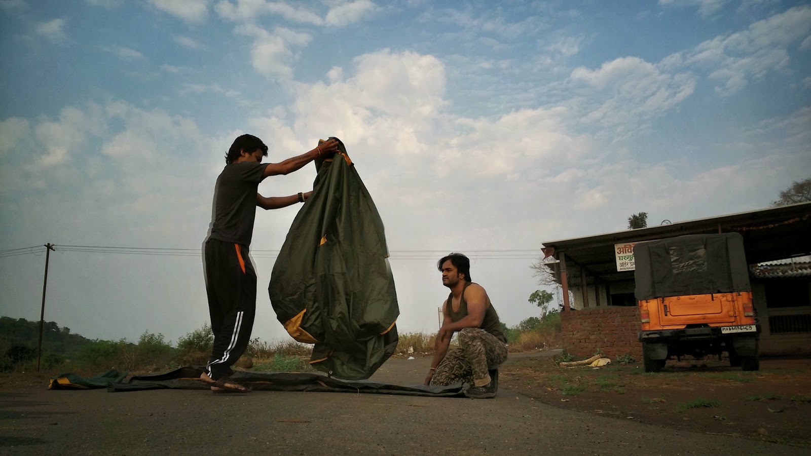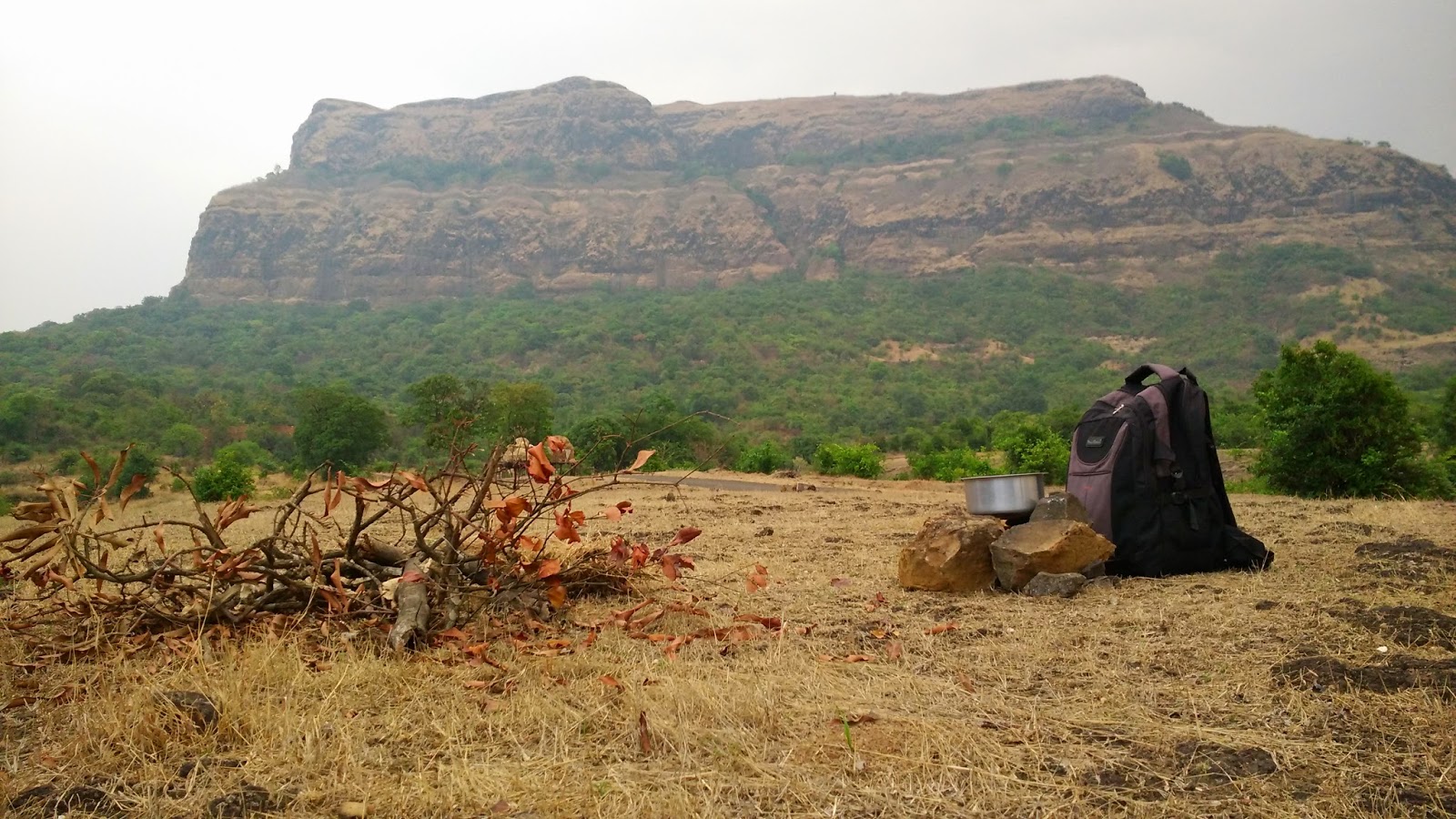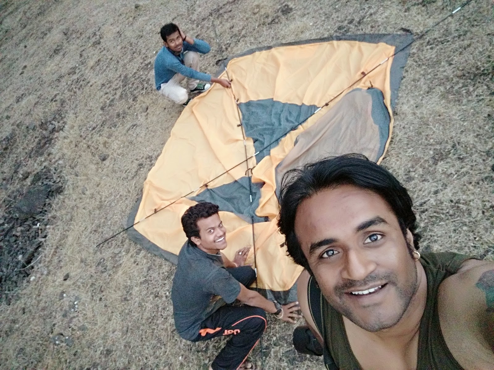 गाडीतला संसार बाहेर काढला, बाबाने मस्त चूल मांडली तिघे मिळून चुलीसाठी लाकड गोळा करू लागलो तो पर्यंत सह्याद्री हळू हळू रंग बदलत होता, नकळत थंड हवा सुरु झाली, ढगांनीही काळी चादर पसरायला सुरु केली होती, तरीपण बाबा आणि लाडका टेंट लावण्यात मग्न होते.