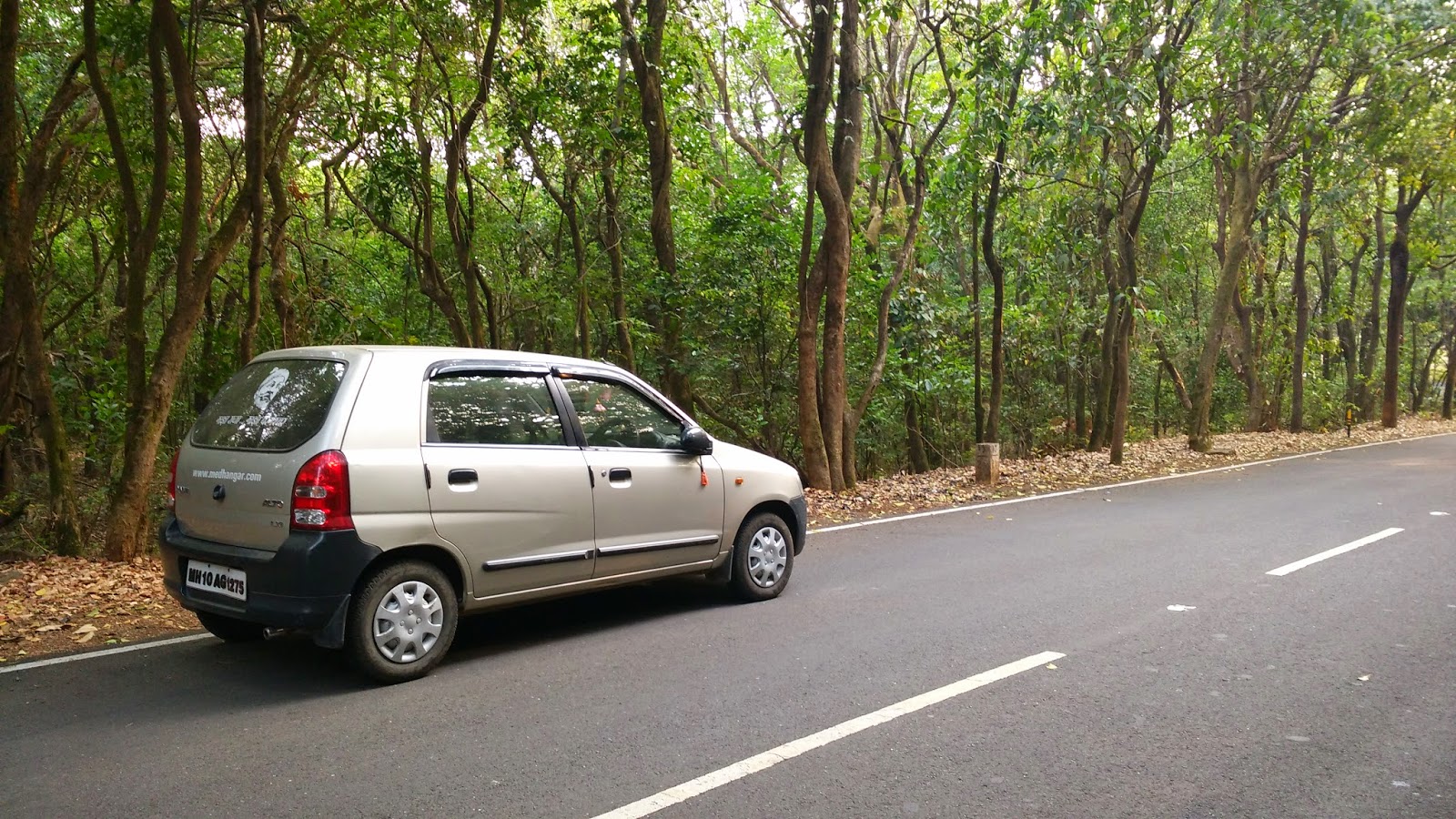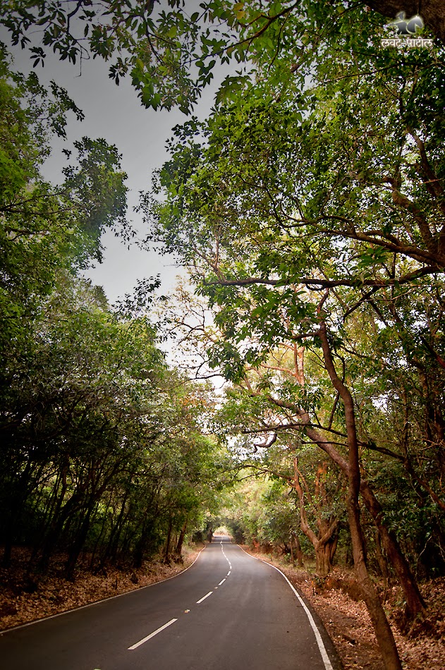 थोडे पुढे जाताच झाडांच्या दाट गर्दीत गुळगुळीत असा रस्ता आणि तोही अगदी मोकळा, फोटो काढायचा मोह कसा आवरणार, गाडी बाजूला घेवून सुरु झाले आमचे शटर चे आवाज, अतिशय सुंदर असे फोटो मिळाले, दोन्ही बाजूला जंगल आणि मधून सुंदर असा रस्ता. बाबा आणि आमच्यामध्ये स्पर्धा सुरु होती मोबाईल मस्त फोटो काढतो का DSLR.