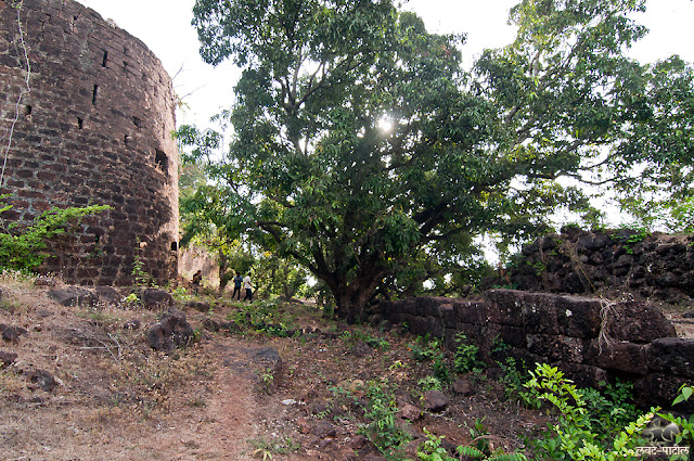 गड अतिशय देखना आहे, बुरुज उंचीला फार मोठे नाहीत पण अतिशय देखने आहेत, किल्ल्याचे विशेष म्हणजे “बालेकिल्ला”, मुख्य तटबंदीच्या आता आनखिन एक तटबंदी, देखने बुरुज आणि आतमध्ये बालेकिल्ला… किल्ल्याच्या आतमध्ये फक्त आंब्याची झाड़े आहेत, भरपूर आंबे होते, काही पिकलेली तर काही कच्चे, श्याब्या आणि संदीप भौनी मस्त आंबे खाल्ले.