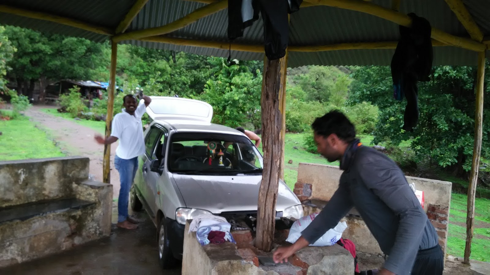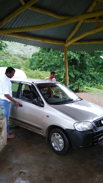 अडचण एक होती की तिथे कपडे बदलायला जागाच नव्हती, पुढेच एक जागा दिसली वरती परता लावला होता कदाचित पर्यटकाना बसण्यासाठी बनवले असावे, मी आपली गाडी सरळ आता घेतली आर्धी गाडी शेड खाली गेली, मग आवरा-आवर सुरु झाली …..