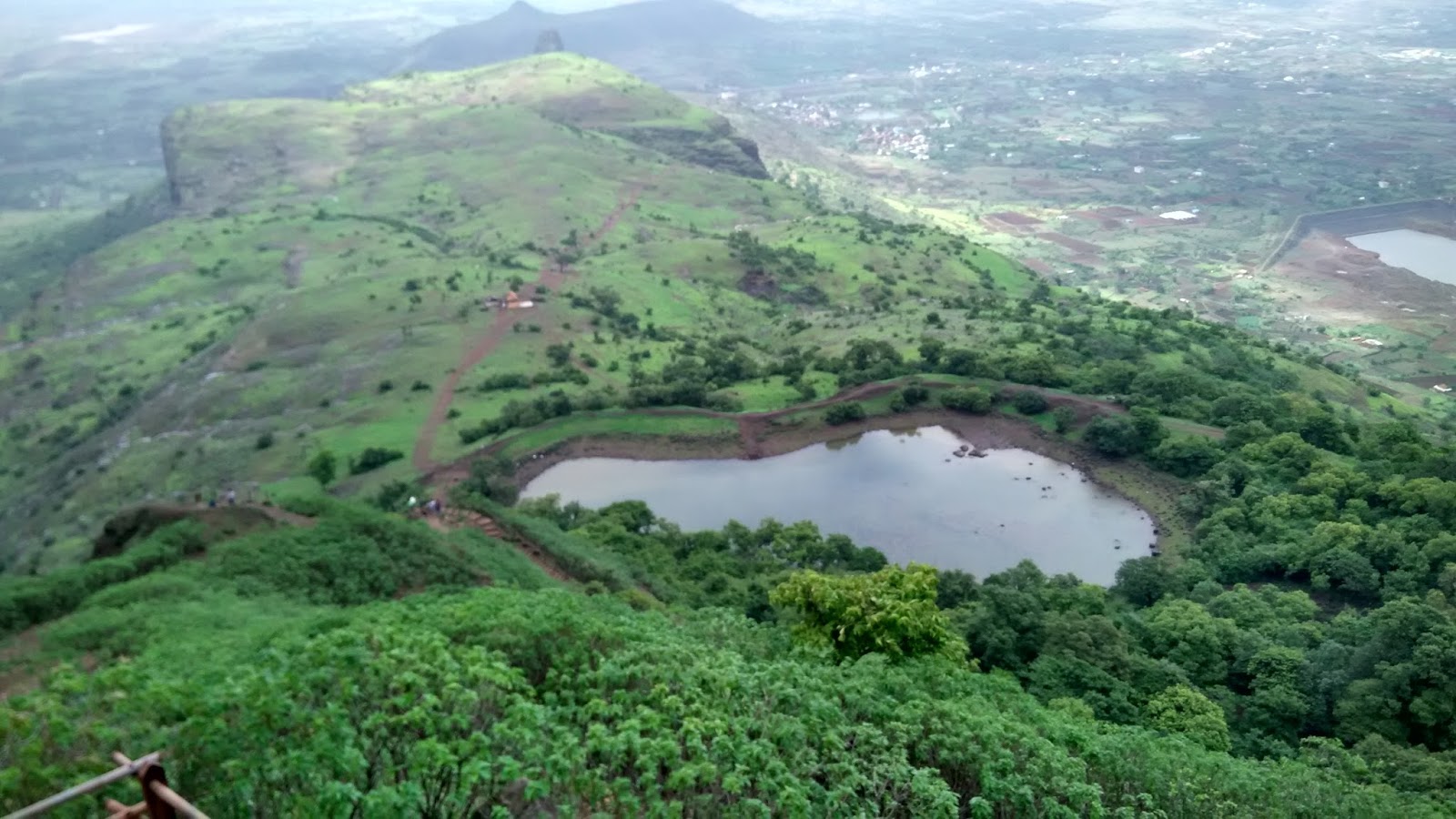 पुढचा विषय म्हणजे अंजनी मातेची गुहा … चर्चेत समजले होते की जबरदस्त गुहा आहे, म्हणून पाहण्यासाठी सगळे आतुर होतो … पायऱ्या उतरून खाली जाताना मध्येच उजवीकडे एक पायवाट जाते तिथून गुहेकडे जाता येते …. खाली उतरताना तलावाचा अतिशय सुंदर देखावा दिसत होता, पण धुक्यामुळे जरा अधून मधून फिक्कट दिसायचा ….