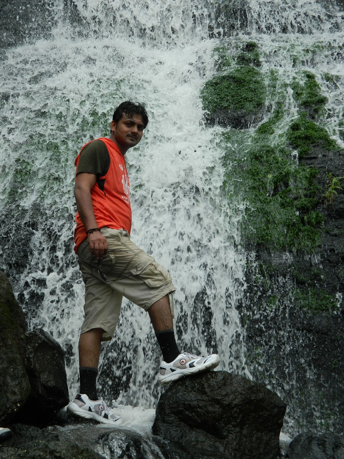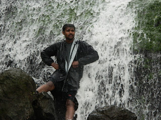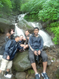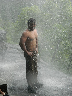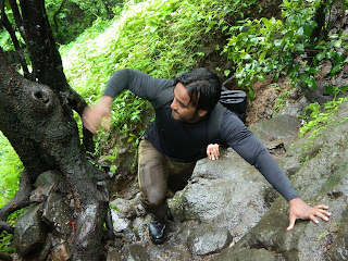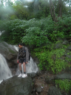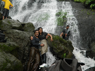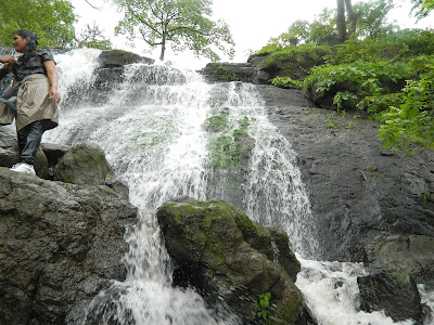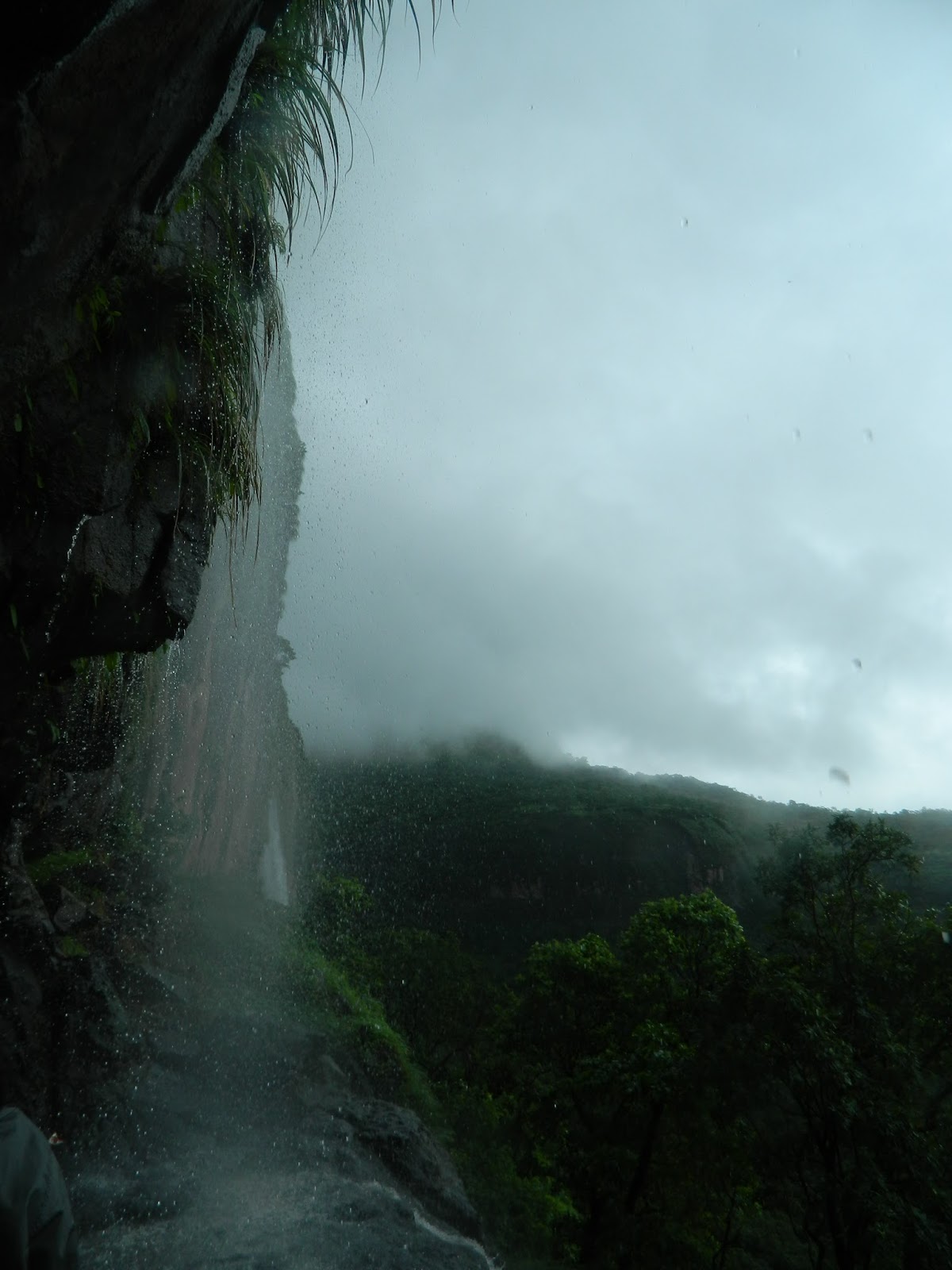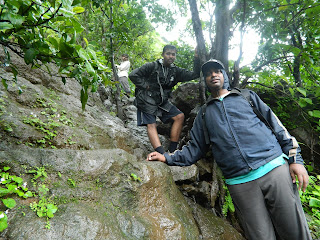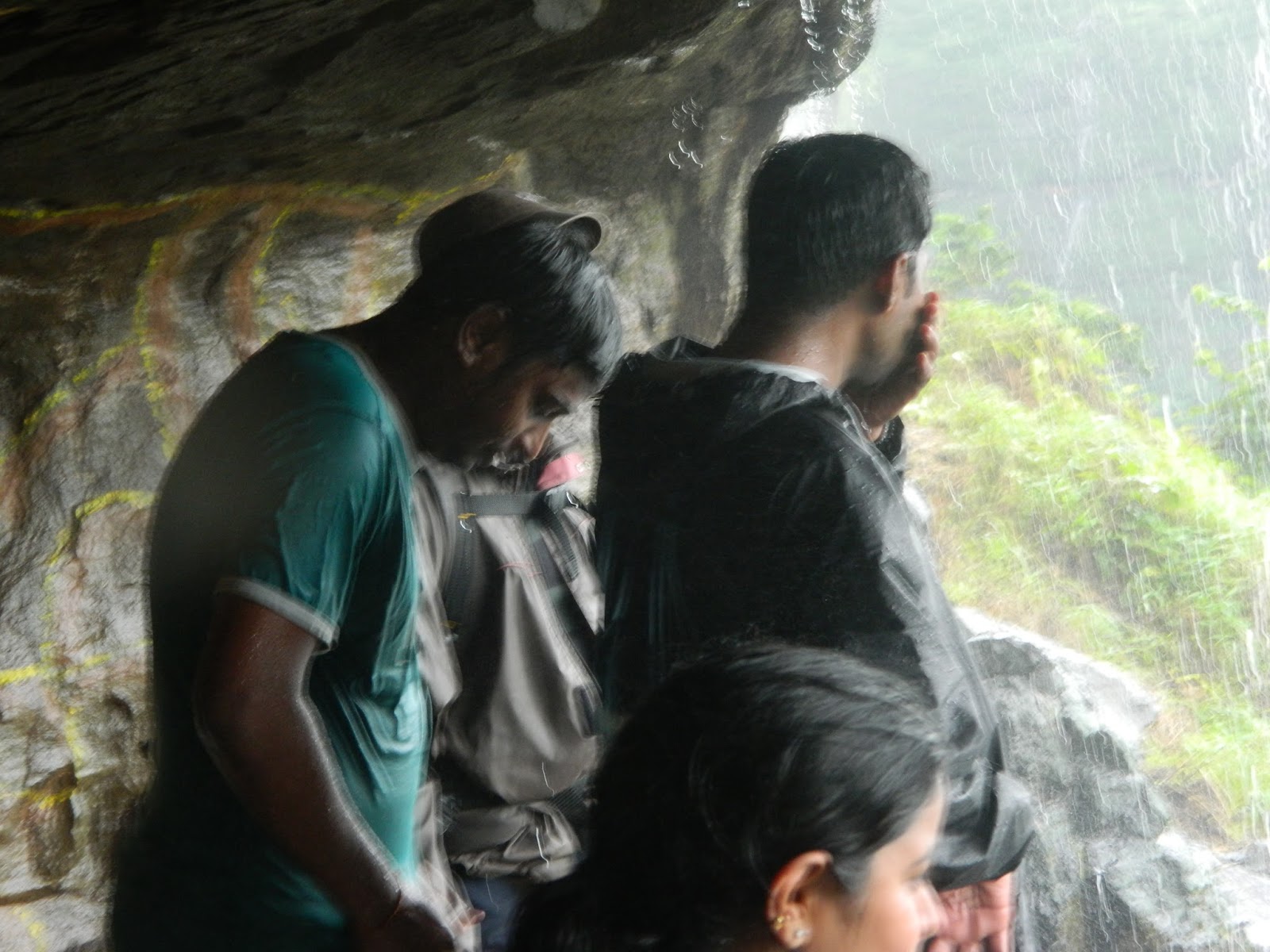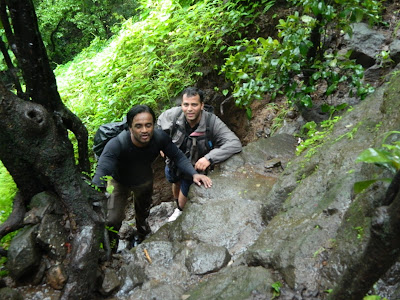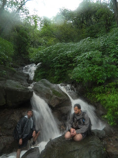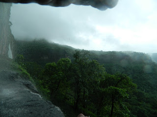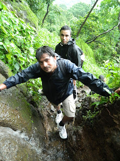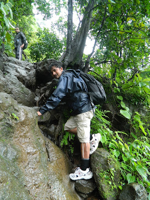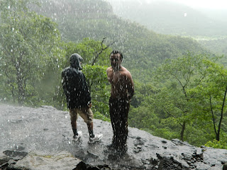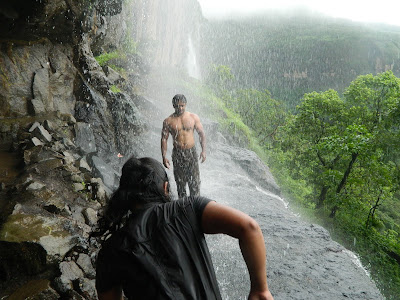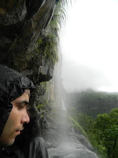 दुसरी शिडी पार केल्यानंतर मी तिसर्या शिडीकडे सरसावलो.. पावसामुळे वरतून घरंगळत येणारे पाणी.. नि निसरडी वाट.. त्यामुळे आम्ही आता सगळे जवळपास घोडागाडी करुनच जात होतो.. तिसरी शिडी मात्र खुपच सोप्पी वाटली.. पटकन चढुन गेलो नि मग पुढे जिथुन पाण्याचा छोटेखानी झरा येत होता त्याच वाटेने आणखी वर चढलो.. खुपच मजा येत होती.. कपडे भिजतील, चिखलाने माखतील इकडे लक्षच नव्हते.. बस फक्त आपल्या हातापायांची पकड बरोबर आहे ना याचा अंदाज घेत पुढे जात होतो.. त्या झर्याची वाटेने वरती आल्यावर उजवीकडे गुहा लागली.. तिथेच काहि काळ थांबुन विश्रांती घेतली.. गुहेसमोरच वरतुन उंचावरुन पडणारे पाणी अंगावर झेलण्याची मजा काही औरच होती. याची कल्पना या फोटोवरुन येईलच..