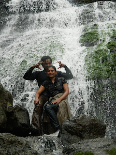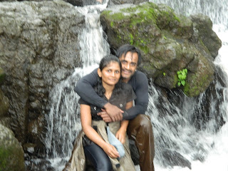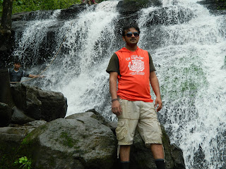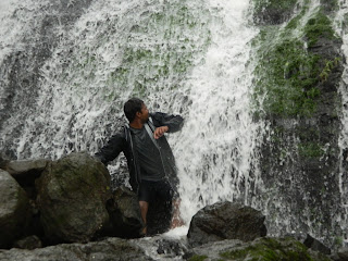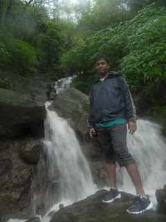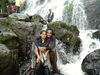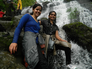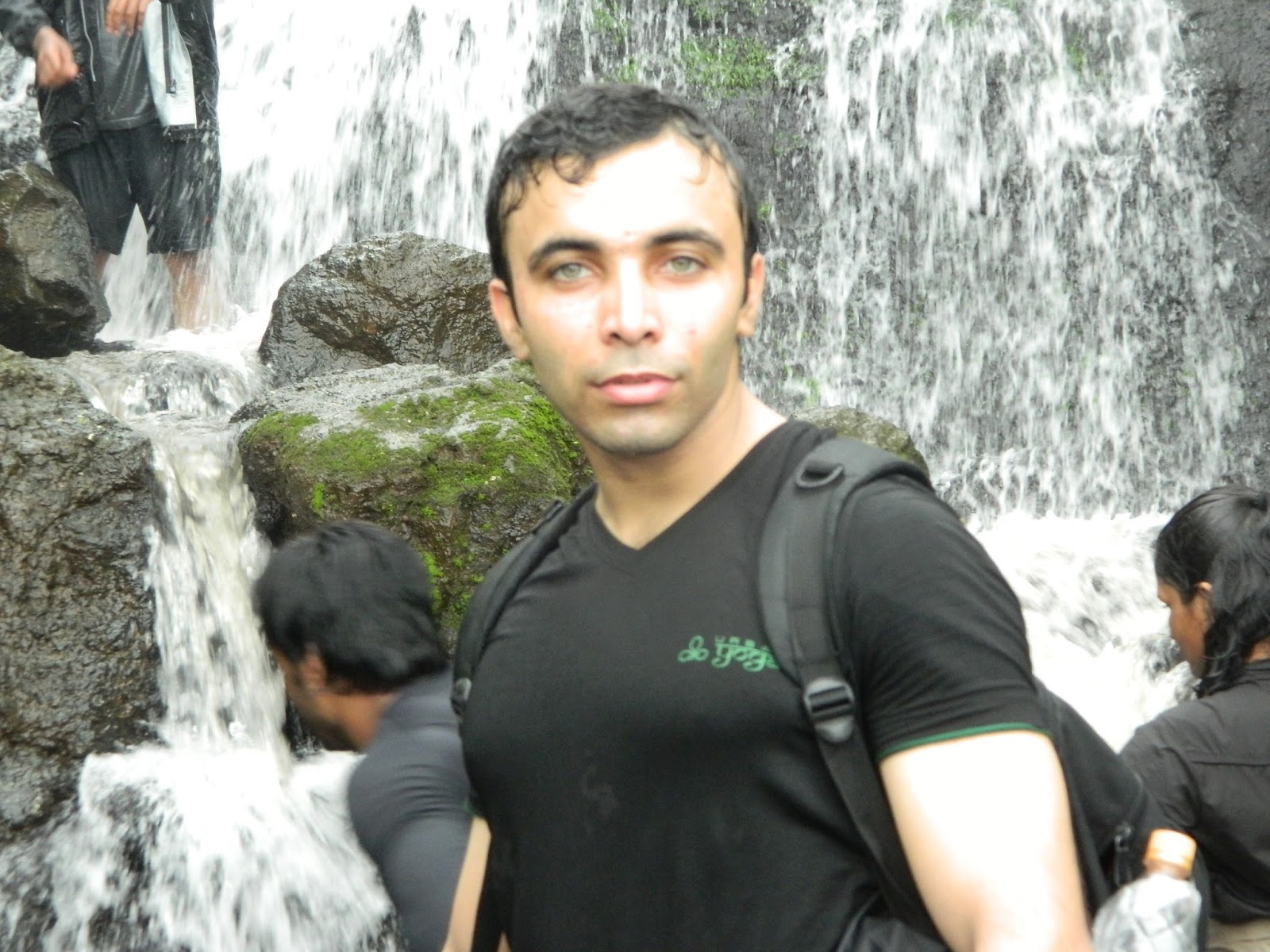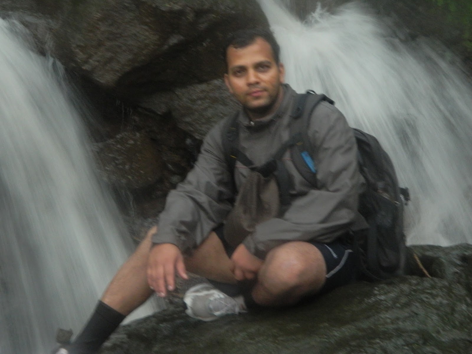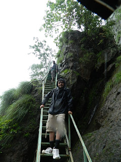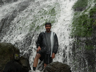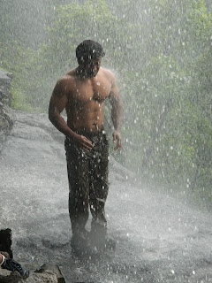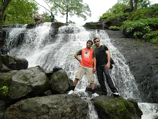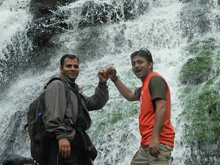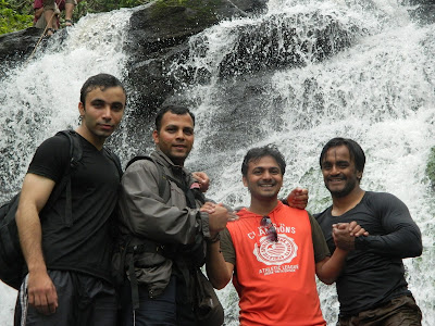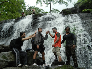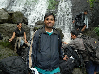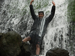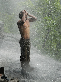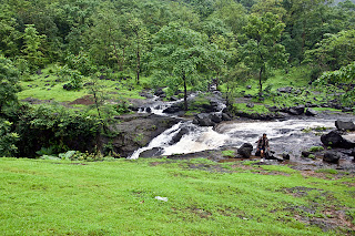 दुसरी शिडी पार केल्यानंतर मी तिसर्या शिडीकडे सरसावलो.. पावसामुळे वरतून घरंगळत येणारे पाणी.. नि निसरडी वाट.. त्यामुळे आम्ही आता सगळे जवळपास घोडागाडी करुनच जात होतो.. तिसरी शिडी मात्र खुपच सोप्पी वाटली.. पटकन चढुन गेलो नि मग पुढे जिथुन पाण्याचा छोटेखानी झरा येत होता त्याच वाटेने आणखी वर चढलो.. खुपच मजा येत होती.. कपडे भिजतील, चिखलाने माखतील इकडे लक्षच नव्हते.. बस फक्त आपल्या हातापायांची पकड बरोबर आहे ना याचा अंदाज घेत पुढे जात होतो.. त्या झर्याची वाटेने वरती आल्यावर उजवीकडे गुहा लागली.. तिथेच काहि काळ थांबुन विश्रांती घेतली.. गुहेसमोरच वरतुन उंचावरुन पडणारे पाणी अंगावर झेलण्याची मजा काही औरच होती. याची कल्पना या फोटोवरुन येईलच..