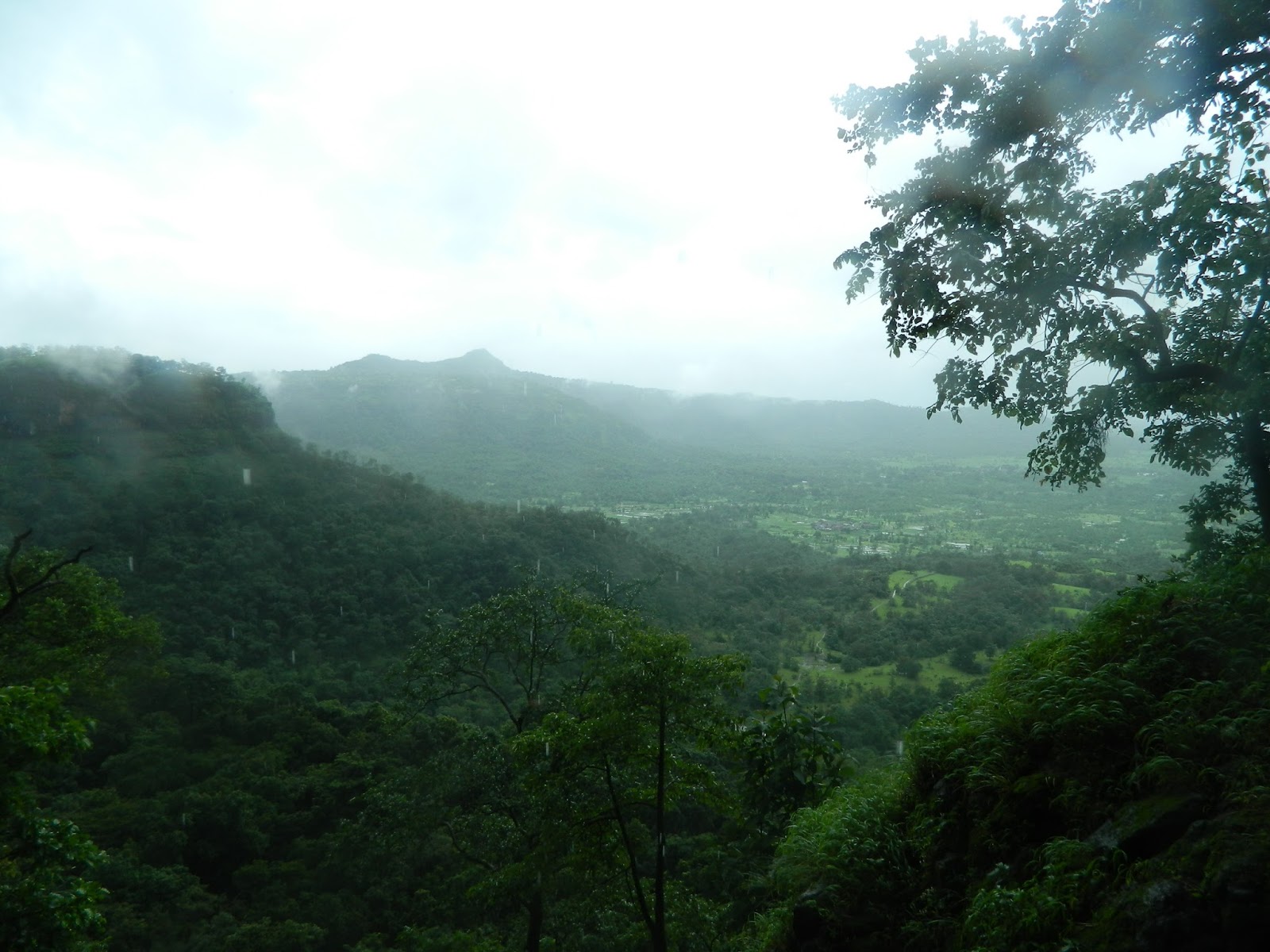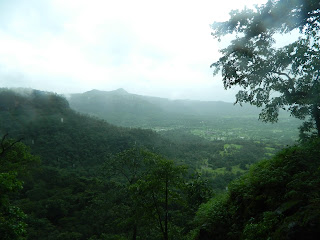 काही मिनीटातच वाट डोंगराच्या कडेने जाउ लागली.. नि समोरील निसर्गदृश्य पाहुन विलक्षण गारवा वाटला.. प्रत्येक ठिकाणी थांबुन बघत रहावे असा नजारा होता.. इतकी उंची गाठली तरी अजुन बराच डोंगर सर करायचा होता.. अर्ध्याएक तासातच पुन्हा वाट जंगलात शिरली.. पावसाळी वातावरण, गर्द झाडी , धुके यांमुळे बरेचसे अंधारुन आले होते.. भुतपटात दाखवतात तसेच वातावरण होते.. माकडांचे घुमणारे “हूप हूप” आवाज नि कुठल्या तरी पक्ष्यांची सुमधुर शीळ याने मात्र तेथील शांतता भंग होत होती..