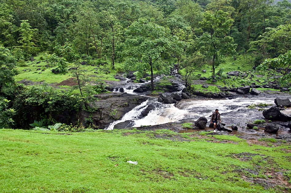 लाल मातीची ओली पाउलवाट तुडवत आम्ही जंगल प्रदेशाकडे वाटचाल करु लागलो.. वाटेत पाण्याचा एक ओहोळ लागला नि तिथेच काही काळ विश्रांती घेतली.. एव्हाना पावसाळी ढगांनी आकाशात दाटी केली होती.. जंगल सुरु होताच घनदाट झाडी लागली नि कातरवेळेस प्रारंभ झाला की काय वाटु लागले.. ती घनदाट झाडी बघुन इकडे एकट्या दुकट्याने येणे फक्त अशक्य असल्याची खात्री झाली.. गाईड हवाच !