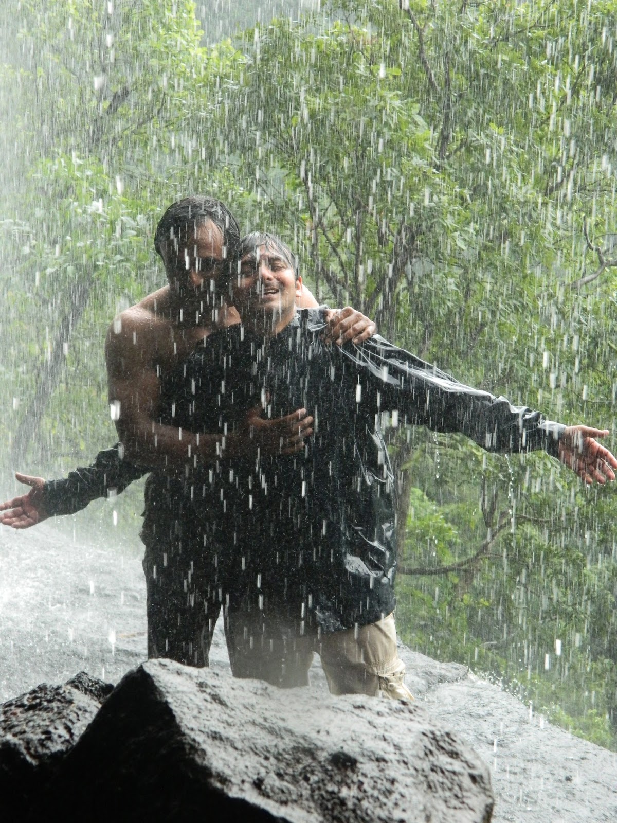 हा थरार कमी म्हणुन की काय पावसाने जोरदार आगमन केले !! या शिडीतुन एकावेळी एकच जण हळुहळु जात होता.. आधीच शिडी घाटातील हा कठीण टप्पा त्यात पावसानेही जोर धरला.. त्यामुळे सगळ्यांना सांभाळताना, सुचना करताना लिडर्सलोकांना बरीच कसरत करावी लागली.. खरी गंमत पुढे होती.. जिथे अक्षरक्षः स्पायडरमॅनसारखे मोठ्या पाषाणाला चिकटुन जायचे होते.. कारण पुढे चार्-पाच फुट अंतराची वाटच नव्हती.. तिथे फक्त पाषाणाला असलेल्या खाचांमध्ये हात घालुन मोक्याच्या जागी पाय ठेवुन ती वाट पार करायची होती..