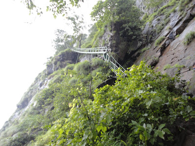 पहिलीच शिडी डाव्या बाजुला दिसली जी एका मोठ्या खडकावरुन दुसर्या खडकावर जात होती.. मध्ये १०-१५ फुटाची दरी नि पुढे तिला लागुनच अजुन खोल दरी होती.. (किती खोल ते नीटसे आठवत नाहीये) पुढे ती शिडी जरी चढुन गेलात तरी क्षणाची उसंत नव्हती.. तिथेच खडकाला धरुन उभे रहायचे होते नि दोनवितभर असणार्या वाटेतुन पुढे सरकायचे होते.. याची कल्पना या फोटोवरुन येईलच..