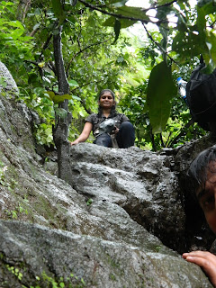 एक तास गेला तरी शिडीचा काही पत्ता लागत नव्हता.. आता येइल म्हणता म्हणता काहि मिनीटातच जंगल मागे सरले नि डोक्यावरील झाडांचे छप्पर गायब झाले.. पुढे जायची वाट पण बंद झाली कारण समोरच उंचसा कातळकडा उभा राहिला.. एव्हाना आम्ही देखील बरीच उंची गाठली होती ते मागे वळुन पाहताच लक्षात आले.. आता पुढची वाटचाल त्या डोंगराला वळसा घालुन करायची होती.. जिथे शक्य नाही तिथे लोखंडी शिड्या लावलेल्या आहेत..