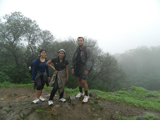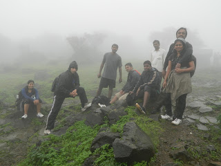 काही अवधीतच गर्द झाडीच्या जंगलातुन बाहेर पडलो नि चढण लागले.. शेवटच्या टप्प्यापर्यंत आलो होतो पण त्याचबरोबर चालही आमची मंदावली होती.. हवेतील गारवा तर विलक्षण वाढला होता.. मागे पाहीले तर गोगलगाय गतीने येणार्या मंडळींचा मागमुसही नव्हता.. पण प्रत्येक घोळक्याबरोबर एकेक ट्रेक लिडर राहत असल्याने चिंता नव्हती.. काही मिनीटातच आम्ही वरती पोहोचलो.. तिथे धुक्यामुळे फारच अंधुकसे दिसत होते.. बोचरी हवा अंगावर शहारे आणत होती.. अशा धुंद वातावरणात आम्ही लागलीच धरतीला पाठ टेकवली.