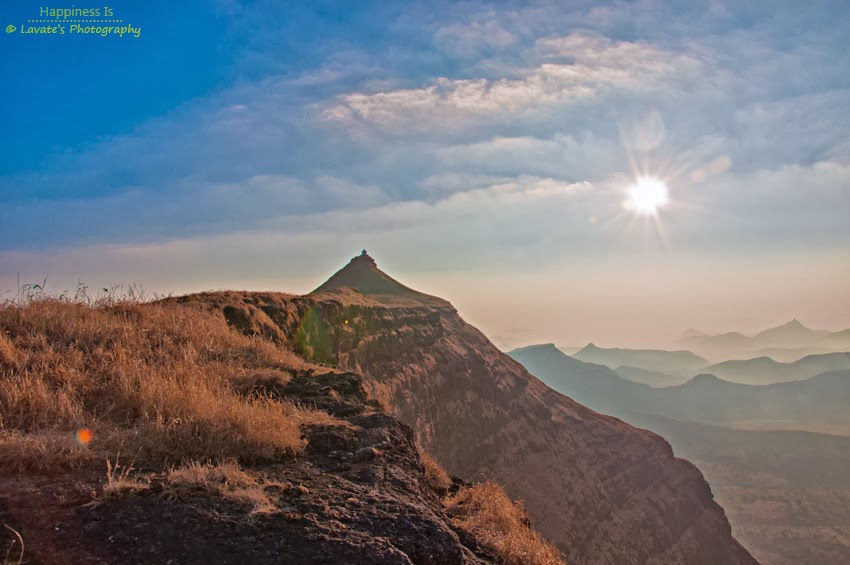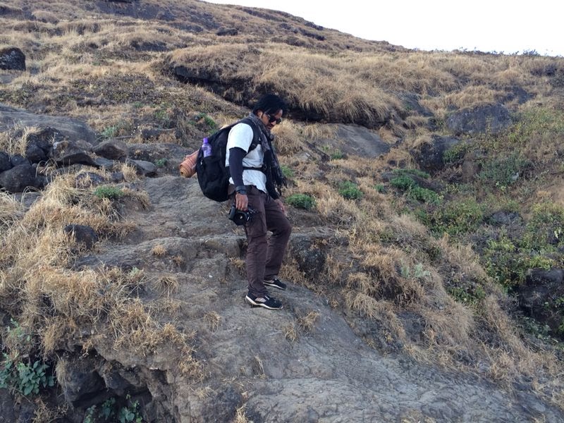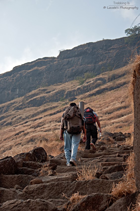 किल्ल्याच्या पायथ्याला पोहचलो रस्त्याच्या उजव्या बाजूलाच १-२ दुकाने होती बाजूला गाडी लावायला जागा होती , तिथे गाडी लावली , १-२ वस्तू दुकानातून घेऊन आम्ही ट्रेक सुरु केला, शक्यतो मुक्कामाला कमी जाणारे ट्रेकर्स आम्ही यावेळी मुक्कामाला आलो होतो त्यामुळे ब्यागेत समान जरा बर्यापैकी होते त्यामुळे वजन खूप होते आणि त्याची जाणीव आम्हाला अगदी सुरवातीलाच झाली आणि चांगलीच दमछाक होत होती. तरीपण काही पर्याय नव्हता चढाई सुरु ठेवली वाटेत फोटो कडत कडत आम्ही ट्रेक सुरु केला.