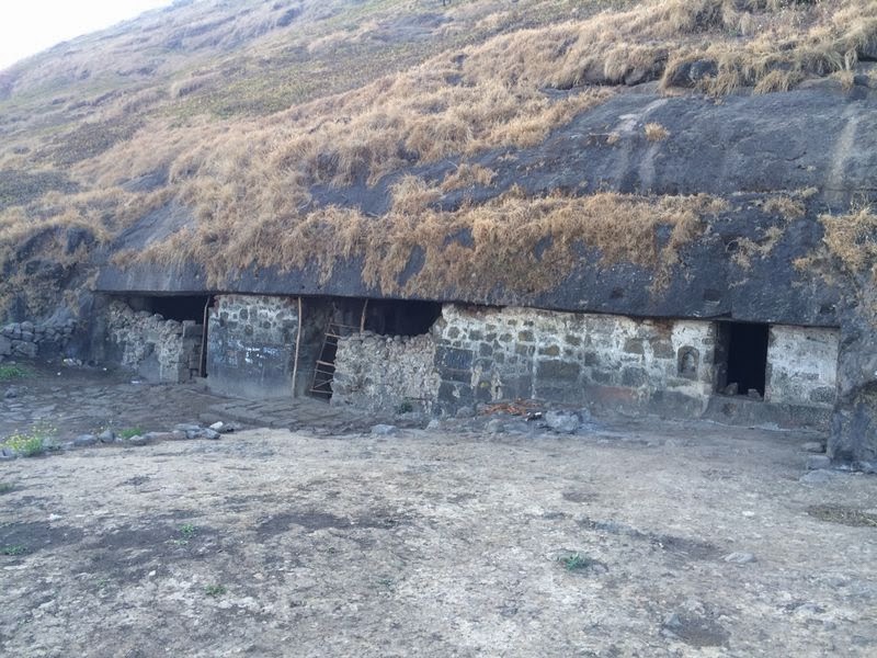 तिथून पुढे मग आम्ही आमच्या राहण्याची जागा म्हणजे “गुहा” शोधू लागलो … पूर्ण गडावर आम्ही तीन जणच होतो त्यामुळे कुणाला विचारायचा प्रश्नच नव्हता … वाटेत एक मोठ्ठा तलाव लागला .. ऐकून माहित होते कि तलावाच्या बाजूलाच गुहा आहे पण कुठे दिसत नव्हती …. शेवटी मी आमचे मित्र पंकज झरेकर न फोन लावला आणि विचारले … त्यांच्या सांगण्यावरून आम्ही थोडे पुढे गेलो जिथे दुसरा एक मोठ्ठा तलाव होता … त्याच्या बांधकामाची काय ती झलक होती …. अगदी रेखीव असे तलावाचे बांधकाम …. त्या तलावाच्या वरच्या बाजूला गुहा होती …. राकेश ने एक चक्कर मारली आणि त्याला गुहा सापडली … मग आम्ही सगळे गुहेच्या दिशेने गेलो…..